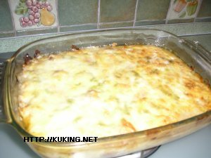 Обжарить шампиньоны и лук, остудить, смешать с сырым яйцом. Выложить в форму.
